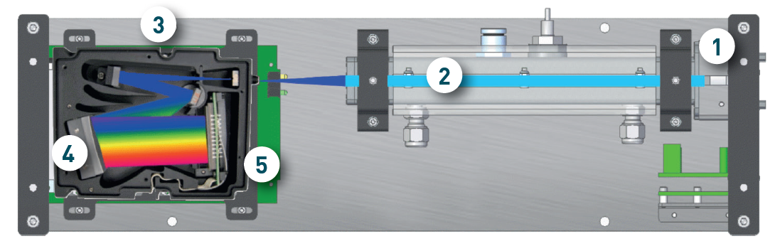 The optical absorption spectroscopy used in our online biogas quality monitoring sensor BioSENSE operates with a UV light source (1) which emits light that penetrates a gas sample in a measuring cell (2). Here light is partially absorbed by the gas molecules. Since each molecule has its own typical absorption spectrum, it is possible to simultaneously determine the concentration of different components of the gas. The remaining light is captured by the receiver (3). The receiver splits the light into narrow wavelength bands using an optical grating (4). Finally the light is captured by a CCD (5) and transformed into an electrical signal for processing. By adapting spectrometric technology to the analysis of biogas, its typical contaminants like VOCs, H2S and NH3, can be continuously monitored.
