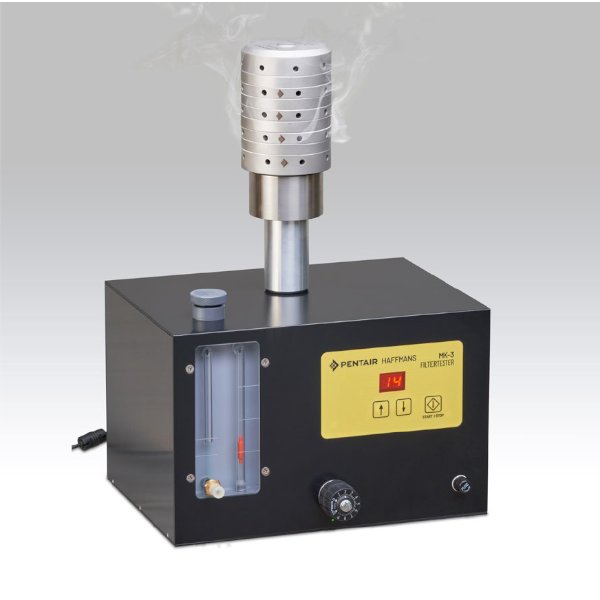 With Pentair Haffmans CPM® Filter Tester, type MK-2, the filter test can be performed in just a few minutes. To simulate microorganisms, a micro-fog or series of smoke-like particles is generated within the filter tester from non-toxic synthetic hydrocarbons. These hydrocarbons form micro-drops of 0.2 to 2.5 μm. This fog is applied under pressure from an integrated compressor to the sterile filter being tested. The fine fog particles quickly penetrate even the smallest leaks in the filter providing immediate visual identification. This procedure does not damage the filter element.