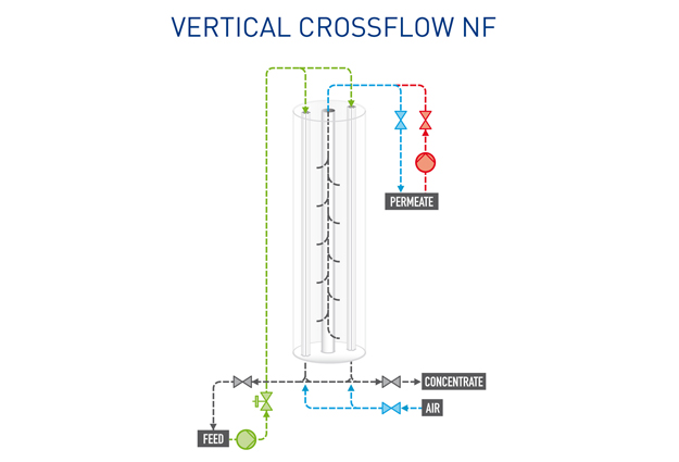 The X-Flow HFW1000 Membrane Elements are operated vertically. The membrane elements are operated with crossflow (feed- and-bleed).
